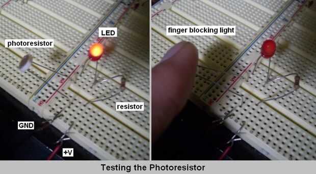 (1) establecer el circuito en un protoboard según el diagrama (primera imagen). Puede probar el fotoresistor tapando con su mano (segunda imagen).