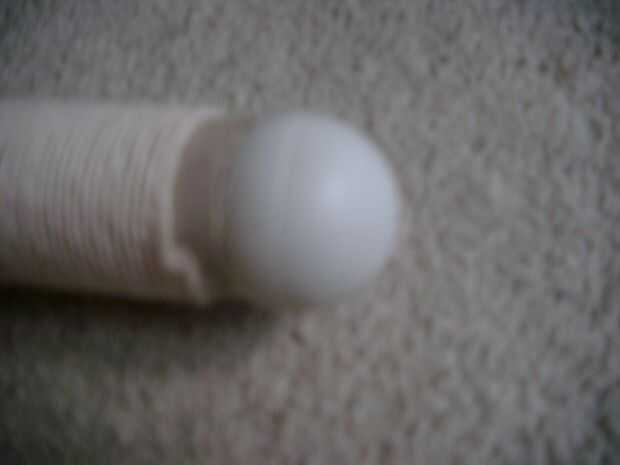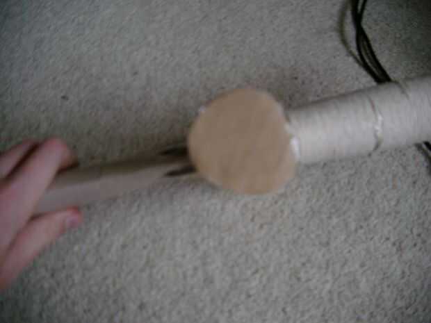 Usaba una pelota de ping-pong para el pomo en la parte inferior de la manija, pero puede usar lo que quieras. También hice un disco cardboad con el diámetro de la anchura de la hoja, cortar por la mitad, y luego grabado en lugar hacia arriba para añadir soporte a la hoja, que entonces dejó de bamboleo en todos. Sellado de los extremos del protector cruzado con dos discos de cartón más.