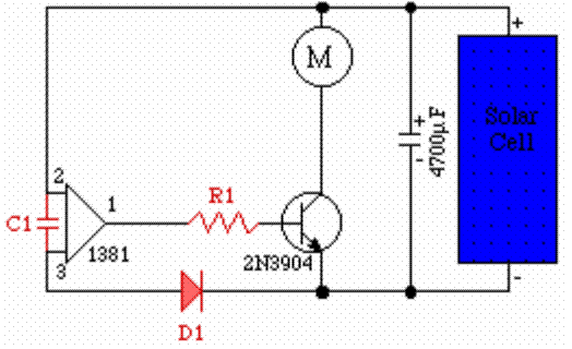 En el diagrama del circuito, C1 es un condensador, D1 es un diodo, R1 es un resistor y el M dentro de un círculo es el motor.