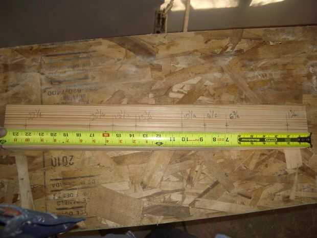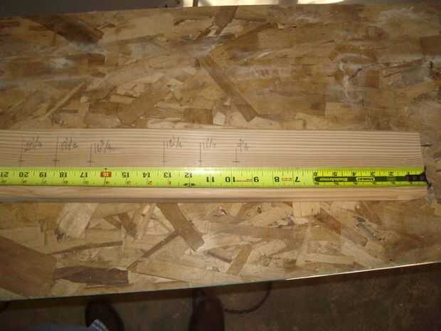 En la cara unchamfered de cada 30" pieza, marca 9-3/4", 11-1/2", 13-1/4", 16-3/4" 18-1/2" y 20-1/4" marca entonces los centros (1-3/4" desde el borde). Ver la 1ª foto. Taladre orificios piloto de 1/8" en estos lugares.