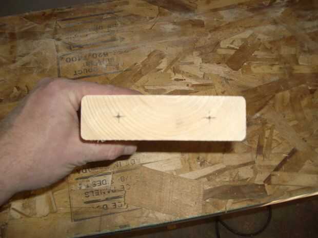 En uno de los extremos de los 2 x 6 más corto, marcar el centro absoluto. O el otro extremo, marca 1-1/4" en cada borde y luego marque los centros. Taladro 1/2" diámetro, 1/2 agujeros profundos en estos lugares. Ver fotos de la 3ª y 4ª. Puede que desee una abrazadera o un juego extra de las manos al taladrar los orificios.