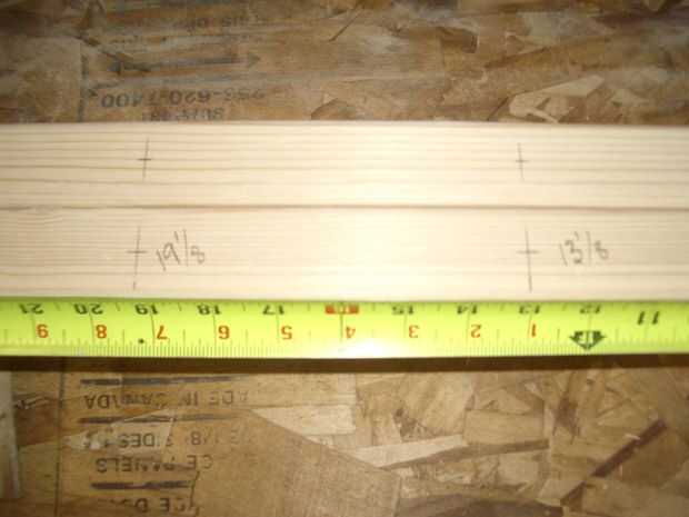 Alinear dos de 2 x 6 cara a cara de modo que parecen una flecha cuando se mira desde el borde. Ver la 1ª foto. Enganche la cinta en una de las marcas de largo (cola de las puntas de flecha) 13-1/8 y 19-1/8". Transferencia de estas marcas en el borde y luego marque los centros. Ver la 2 º foto. Taladro 1/2" diámetro, 1/2 agujeros profundos en estos lugares. Repita estos pasos con el otro par de 2 x 6.