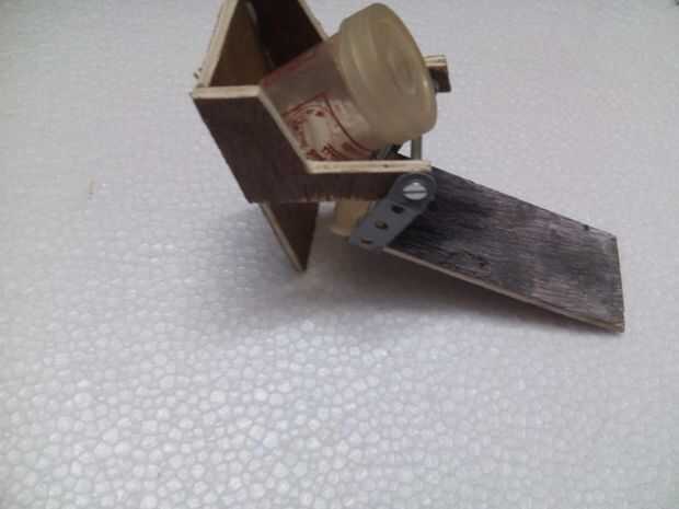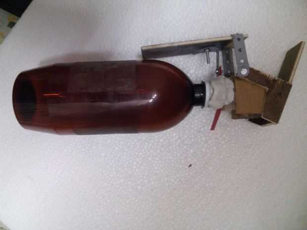 Utilicé madera contrachapada para hacer un disparo de parte y celebración de parte. La pequeña caja de plástico se utiliza para rellenar el bicarbonato de sodio cuando disparo se mueve hacia arriba la tira con el agujero se mueve y soda de la banca es en la solución de vinagre y agua. Y reacción crear a CO2 que es liberación de la manguera.