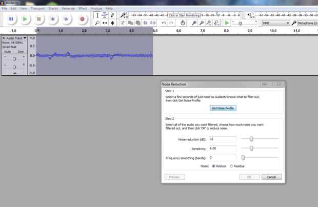 Todo lo que necesitas hacer es dejar unos segundos de silencio antes de cualquier grabación para obtener el perfil de ruido. Destacar este 'silencio' e ir a efectos > reducción de ruido, a continuación, haga clic en "obtener Perfil de ruido". Entonces, una vez has grabado algo, resalte la grabación entera e ir a efectos > reducción de ruido y haga clic en 'Aceptar'. Usted realmente no necesita preocuparse acerca de los otros parámetros, las opciones por defecto son generalmente bastante buenas.