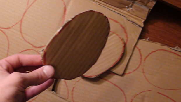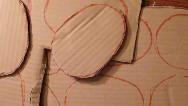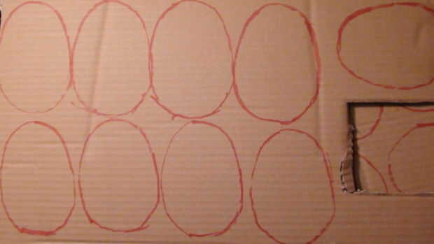 Después de haber encontrado un buen grueso corrugado caja de cartón, cortarlo en dos trozos de tamaño de pecho grande. A continuación, dibuje una forma simple de huevo en la esquina de una de las piezas... cortarlo, entonces sirve como plantilla para trazar la forma unas 20 veces más. Use el cuadro para obtener tantos discos de huevo pequeño como sea posible. No espaciar demasiado, excepto el ambiente :)