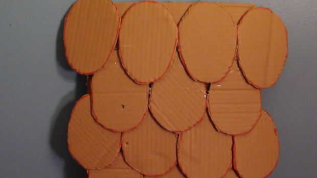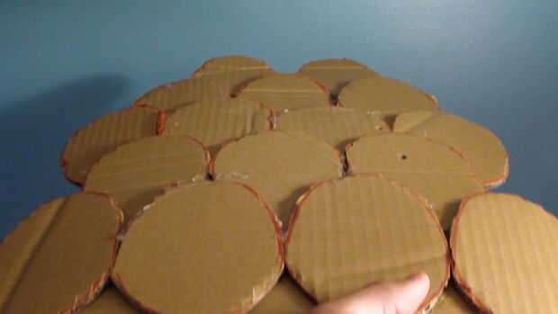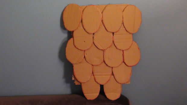 Después de cortar los discos de huevo, espacio les hacia fuera en un orden superpuesto, dependiendo de lo grande de una persona se encuentre. Pegamento caliente de ellos en el otro pecho tamaño pedazo de cartón cortado antes. Obviamente cuanto más grande eres, los discos más pequeño se necesita. Esta armadura está hecha para soportar múltiples disparos, al igual que lo real, así que más discos = más protección.