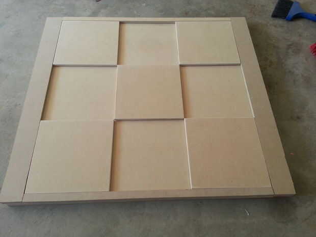Los "planos" para el corte de los paneles es conexión (la cuadrícula de la escala de 1 pulgada de imagen). En los "planos" se dará cuenta que casi todas las piezas se pueden cortar de dos paneles de 4 x 4 pies, sin embargo, hay dos más cuadrados de 11 x 11 pulgadas que tendrían que venir de algún otro panel. Encima compré en 1/2 pulgada MDF porque no eran mucho más caras que 4x2ft hojas 4x4ft hojas, y no he podido encontrar nada más pequeño que el. Tener la hoja adicional de 1/2 pulgada MDF fue ok, porque me cagué unos cortes.
