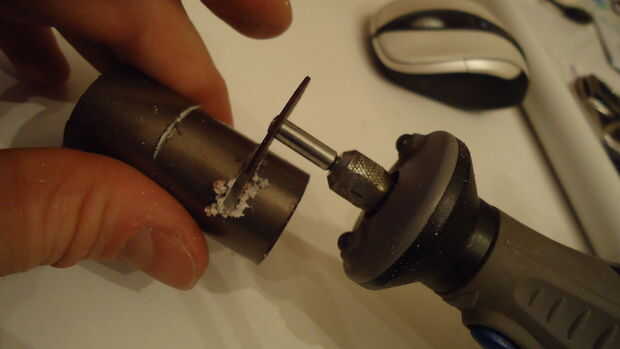 Usaba una herramienta dremel, pero probablemente sería mejor una sierra para metales. Esto es donde la correa se enroscará a través. Usé un cuchillo x-acto para limpiarlo.