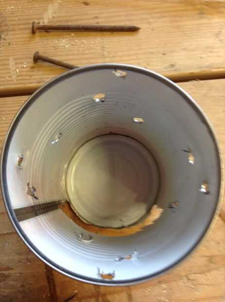 La razón por la que hice la fuente de calor era primero porque determina el tamaño de la fuente de calor cuán grande es el agujero de la can. Tan usted use tijeras para cortar un agujero en la parte superior y otra lo suficientemente grande como para caber su fuente de calor/registro. Luego utilice su perforador y un martillo para perforar el agujero en la parte superior e inferior para que se ventile bien. Esta parte es una característica opcional parrilla puede perforar el agujero en la parte superior e Inserte el alambre en la parte superior en forma de Cruz.