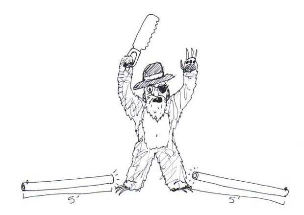 Utilizando la segueta o algún instrumento similar de destrucción, vio su tubería de PVC en mitad, por lo que tendrás dos idénticos 5' longitudes con eyescrews incrustado en un extremo de cada uno. Entonces, Únete a las dos mitades metiendo em en el acoplamiento de PVC (los bits que estaban en el centro deben ir en el acoplamiento, no los que tienen los agujeros para los ojos).