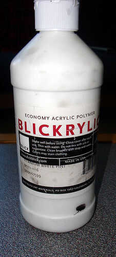 -El bloqueador: Esto es lo que pones en la pantalla, bloquear las partes que no quieres la tinta a atravesar. Impresión de la pantalla la mayoría utiliza una técnica de transferencia de la foto que utiliza algunos productos químicos, y luz y más cosas para comprar especializaron. Utilizando la pintura había en mano me salvó algo de dinero aquí. Usé algunos pintura acrílica blanca que tenía en mano. Pegamento Elmers, pegamento de madera, tal vez trozos de papel si trabajas derecho hará el trabajo. ($2 (creo) una pequeña cantidad)