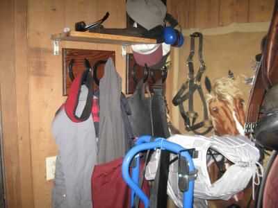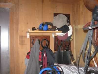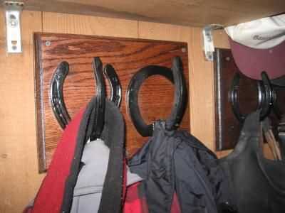 Me ha pasado a tener unos ganchos de herraduras (hizo en una clase de soldadura). Las herraduras se son demasiado angostas para colgante bordada; pliegue o colar el cuero. Pero se hacen grandes ganchos para las varias cosas que puedo quiero hacia fuera en el granero: capa de granero, bufanda, bolsa de regalo, mitad caps, sombrero para el sol y así sucesivamente. Me sostuvo hasta la pared para ver qué altura sería manejable para el acaparamiento de artículos de los ganchos, utiliza el nivel para llegar directamente una vez que había seleccionado el lugar y atornillada en.