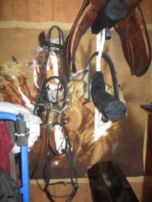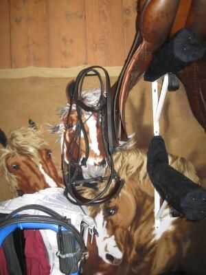 Una vez tuve cuatro ganchos en su lugar, que estaba hecho. Tengo silla de montar estantes, ganchos, un lugar para pegar cosas en el piso, ganchos y un estante para almacenar artículos no amurado en la pared y un carro para realizar mi rumbo al granero de brida. Yo soy todo listo. Debe ser fácil y barato para que otros puedan crear sus propias salas de tachuela con similares materiales y métodos :)