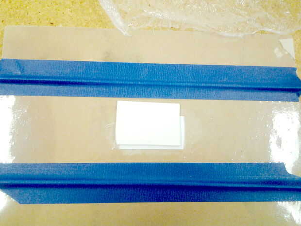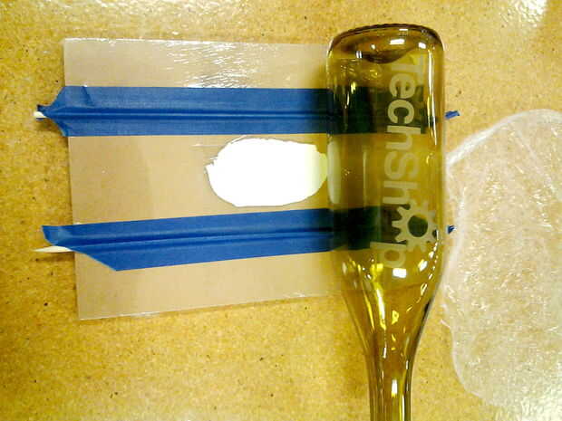 Coloque el material en la envoltura de plástico sobre el patrón de papel. Coloque una segunda hoja de plástico sobre el material. No hice esto en las fotos porque estaba trabajando con arcilla polimérica. Luego use una botella para rodar hacia fuera en una hoja uniforme que cubre su patrón de papel. Te recomiendo tener un poco de traslapo alrededor de todo el camino. La plantilla de papel que hemos hecho es sólo una guía para saber acerca de cuánto necesitamos. Desea la superposición en la parte superior para rellenar la punta de los dedos. Desea la superposición en la parte inferior para hacer un bonito labio para la apertura del dedal. Desea que la superposición de los lados para que necesitan juntos en un cilindro. Puede utilizar una hoja de afeitar para cortar los lados. Lanzó mi material al menos 1/8 de pulgada de grosor (unos 2-3 mm).