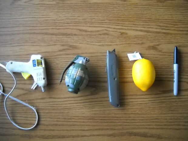 Necesita un falso limón (cerca de 3 dólares), una falsa Granada (unos 2 dólares), una pistola de pegamento caliente, una hoja de afeitar y un marcador permanente (opcional).