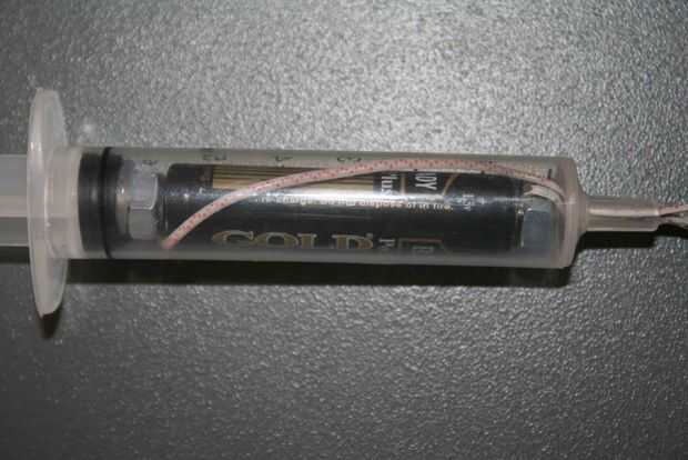 Atar las dos tuercas a los filamentos del alambre con los extremos despojados. Inserte dos cables por la abertura delantera de la jeringa, añadir una batería en el medio.