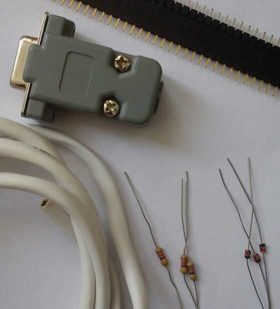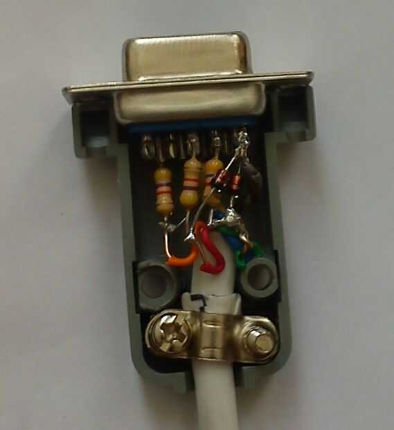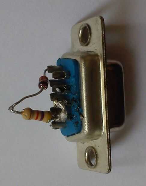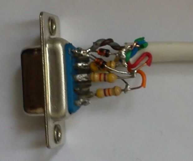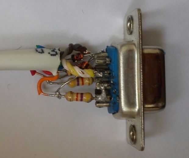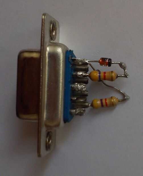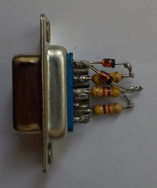 Soldadura de resistencias a los pines 3, 4, 6 y 7 del conector DB9, pin N de diodos al otro extremo de los resistores de la soldadura y la soldadura de la otra pierna de diodos para el pin 5 del conector DB9. La soldadura de cables entre resistencias y diodos y los pines 4 y 5 del conector DB9. Otro extremo de los cables a la parte femenina del jefe del Pin de la soldadura.