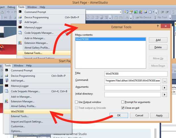 Si usted quiere acceder a WinSTK500 fácilmente ejecutar estudio de Atmel y en el menú herramientas Seleccione Herramientas externas..., añadir una nueva herramienta, establecer el título a WinSTK500, seleccione [instalar Location]\dihav\WinSTK500\WinSTK500.exe como el comando y haga clic en Aceptar. Ahora puede encontrar WinSTK500 en el menú herramientas.