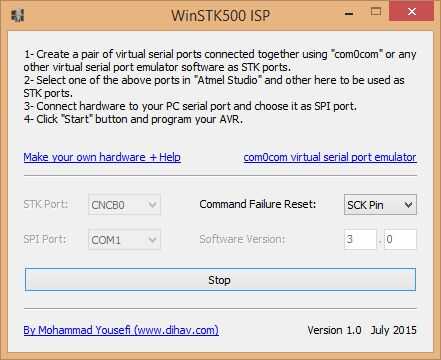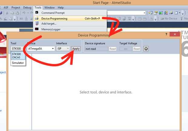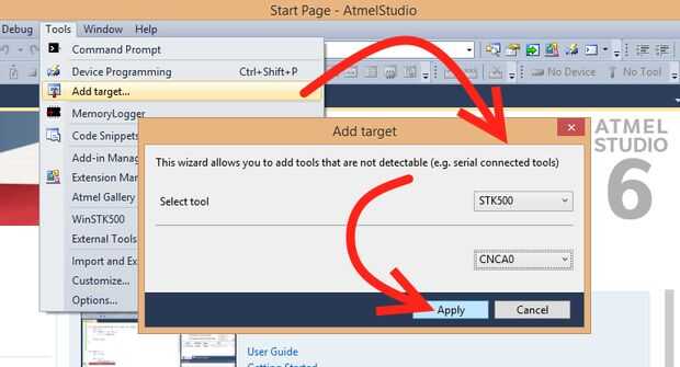 Conecte su MCU para el hardware y conexión a puerto serie RS232. Ejecutar estudio de Atmel, seleccionar WinSTK500 del menú herramientas, seleccione CNCB0 como STK puerto, seleccione el puerto serie del ordenador (normalmente COM1) como puerto SPI y haz clic en el botón de inicio. Haga clic en agregar destino... desde el menú herramientas y agregar una herramienta del STK500 en Puerto CNCA0. Elegir el dispositivo de programación de menú herramientas, seleccione STK500 CNCA0 del menú desplegable de herramienta, elegir el microcontrolador ISP interfaz y haga clic en el botón aplicar. El estudio de Atmel se conectará a WinSTK500.