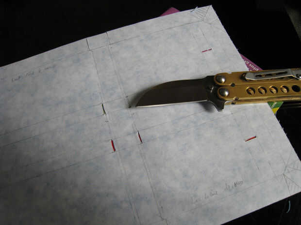 -hacer dos cortes verticales en la parte superior e inferior del centro, donde la portada se se dobla sobre sí mismo más adelante. hacer los cortes a 1mm de los bordes de la columna, para que tengas más espacio para doblar los márgenes dentro de lo notebook.
