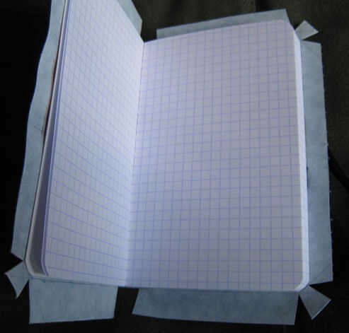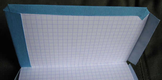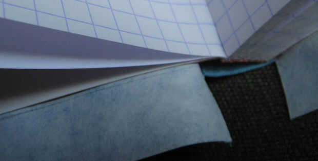 Cuando los dos lados de la cubierta se pegan en el cuaderno Clairefontaine, puede doblar los márgenes en el interior del libro. Mira de cerca en el cuadro 3, verás un pequeño problema: las dos primeras páginas se pegan junto con la aleta de cartón de la notebook! Por lo que no puede doblar los márgenes sobre el interior de la aleta de cartón sin modificaciones.