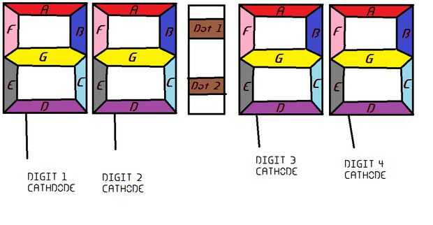 Luego clued y cable LED para cada segmento (se puede ver en la primera foto! Cada área roja es "segmentar"!). Tienes que conectar los leds de los mismos segmentos juntos, y mismos dígitos led de cátodos juntos. Ese colorido cuadro muestra cómo conectar los ánodos de ellos, del mismo color juntos.