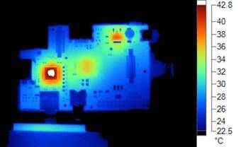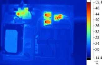 Como se puede ver en la imagen térmica, parte del calor se crea en la PSU cambiar fichas, incluso entonces el max temp solamente 50Grados C en el núcleo del chip. El disco duro no muestra ningún calor. A la temperatura ambiente era 18deg C.