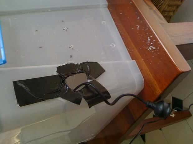 Ahora toma unas cortas tiras de cinta adhesiva y los bordes del agujero para que el ganado ' frotar contra el cable.