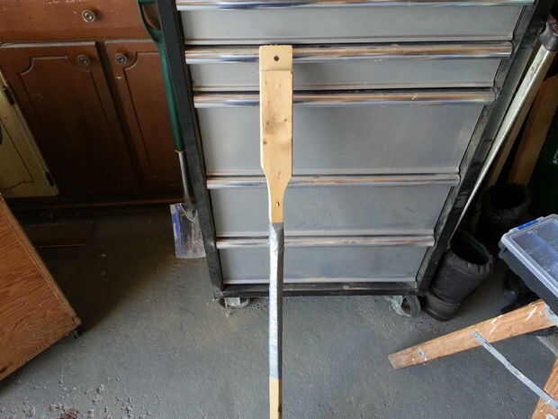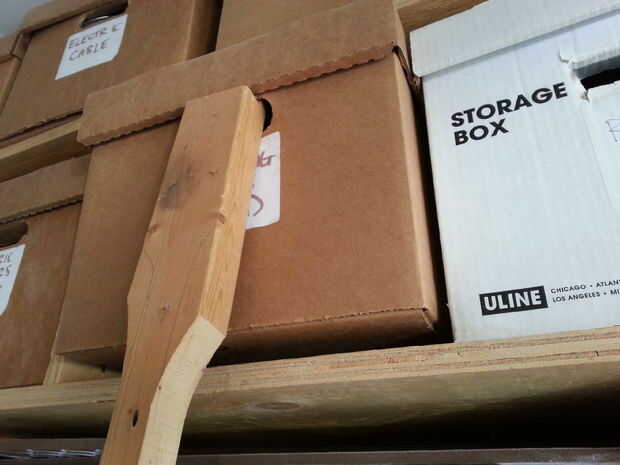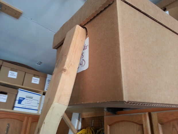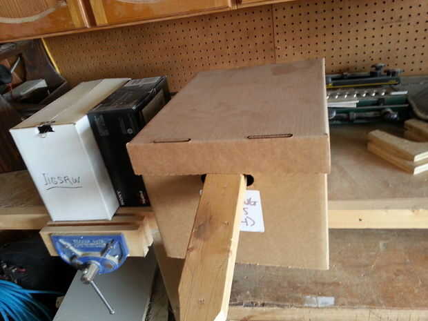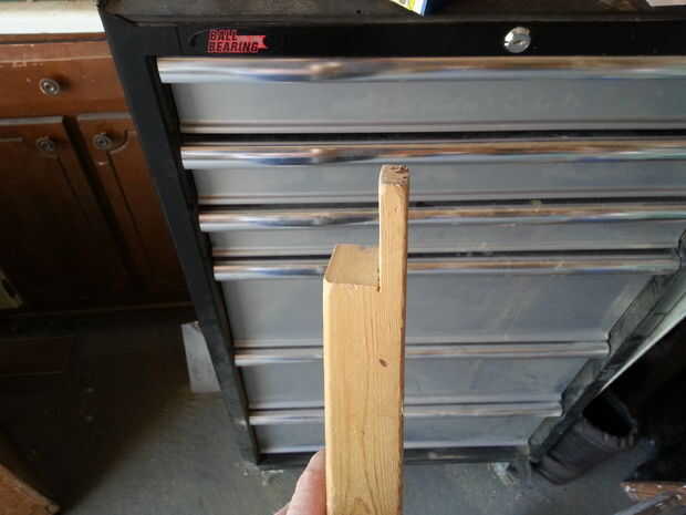 Tomé un 2 x 4 y corte a 44" puso un parecieran en la parte superior que baja 1 3/4" y un labio de 1/2" a la izquierda en él. Utilice este labio para poner en el agujero de la manija de la caja de los banqueros y levante hacia abajo. No puede explicar lo bien que funciona, aunque hay 50 libras en la caja. Probar. Mi garaje es agradable y organizada y siempre sabe donde encontrar de todo. Poner un agujero en la parte superior de la 2 x 4 y a colgarlo en la pared.