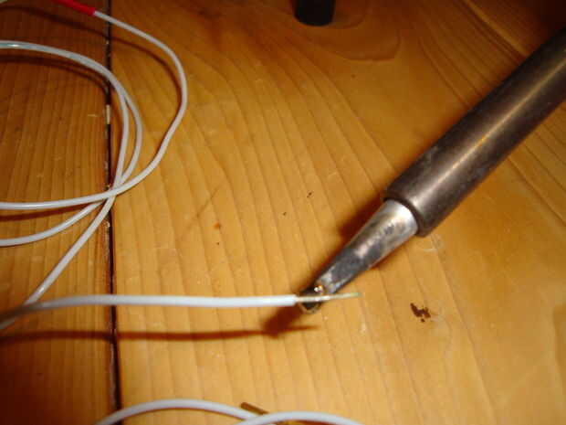 * para cable de la lata, cubrir la parte pelada en flujo. Calentar el soldador y un pegote de soldadura en el extremo del derretimiento. Tocar la soldadura derretida para el alambre expuesto. Que tenga que ejecutar la punta del soldador a lo largo de la longitud de los cables expuestos. Esto cubre todos los filamentos individuales del alambre de soldadura, lo que los hace permanecer juntos y es mucho más fácil trabajar con.