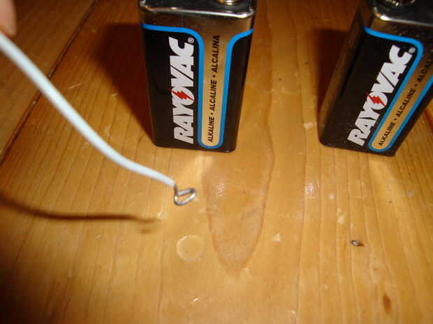 Utilizando los alicates de punta, gire el final estañado en un pequeño círculo. Este círculo debe ser lo suficientemente pequeño como para caber en el terminal negativo de una de sus baterías.