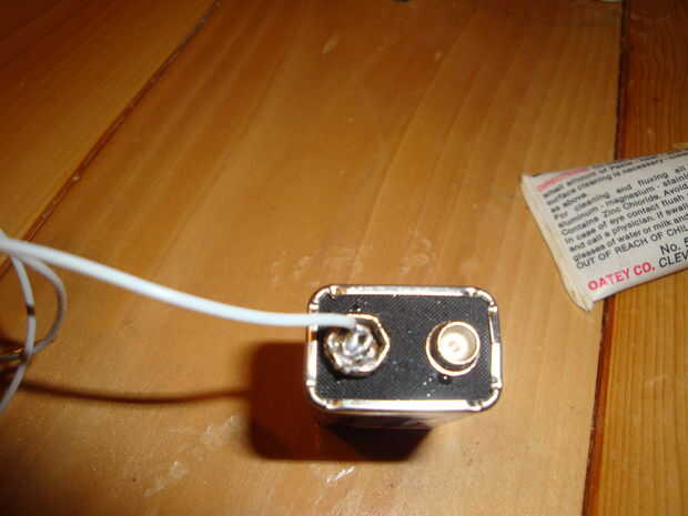 Introduzca el extremo torcido del hilo en el terminal negativo de una de sus baterías. Ponga una pequeña cantidad de flujo en allí. Conseguir un pegote grande de soldadura en la soldadura de hierro, y el cable a la terminal de la soldadura muy rápidamente. Mántengalo en esa posición unos segundos hasta que se enfría.