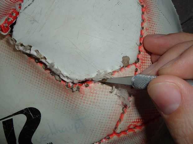 En esta bola y probablemente muchos otros, la vejiga interna se adhiere a la piel externa, por lo que es realmente cerca de desgaste que estás cortando. Separa fácilmente simplemente presionando con los dedos. Si se corta a través, aunque y la fiebre del aire que sale, no te preocupes, esto se convertirá en el orificio de la vejiga en el paso siguiente.
