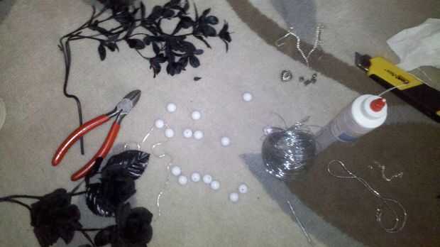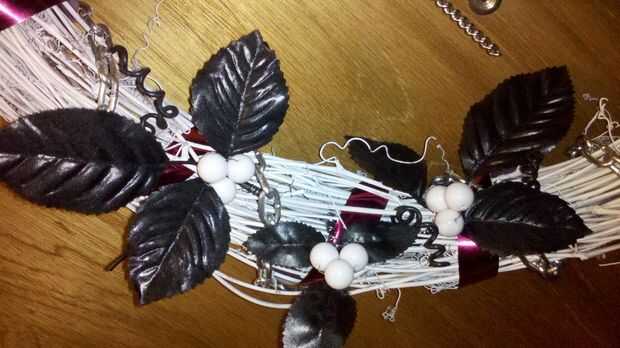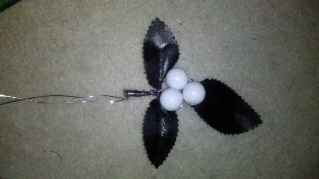 Para hacer el acebo, simplemente utilicé trozos de hoja del falso arreglo floral, alambre y cuentas de un collar de basura. Los más grandes son simplemente alambre envuelto, entonces puso en lugar. Con la adición de algún cable negro para hacer las ramas poco negro.