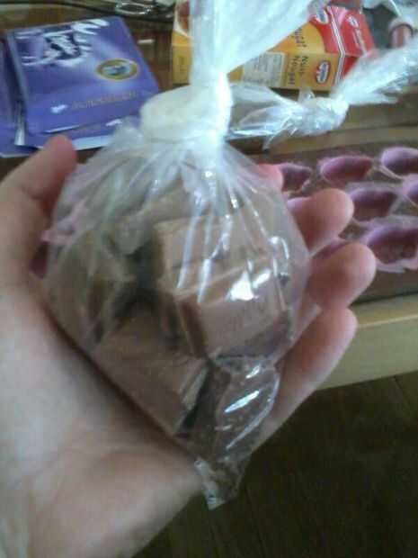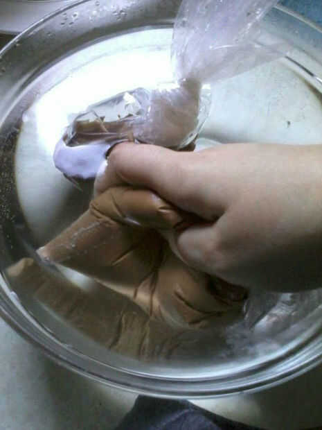 Cuando es totalmente firme, corte abierto su bolso, llenar el chocolate en otra bolsa y cierre firmemente. Continuar con punto 3) y el chocolate será utilizable de nuevo!