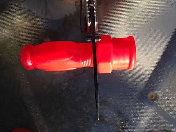 Con las burbujas en el pasado es la hora de preparar el sujetador de la cuchilla que supongo que sería la cubierta de emisor de hoja y estabilizador magnético del anillo si nos referíamos a un sable de luz real. Para ello vas a quitar el anillo de la burbuja, cortar la parte superior de la empuñadura de la varita debajo de la tapa del tornillo y perfore un agujero (u orificio - de plástico delgado) a través del tornillo en parte. Suena como mucho pero es realmente bonito. Sale la parte de la burbuja y el plástico es realmente muy fino que hace que se corte una brisa.