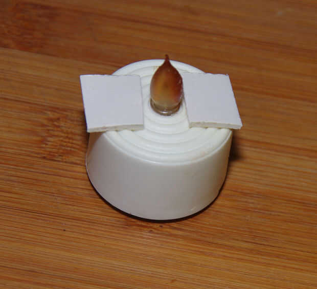 Corte dos piezas pequeñas de doble cara cinta (o almohadillas adhesivas) y fijan ambos lados de la llama de candelita.