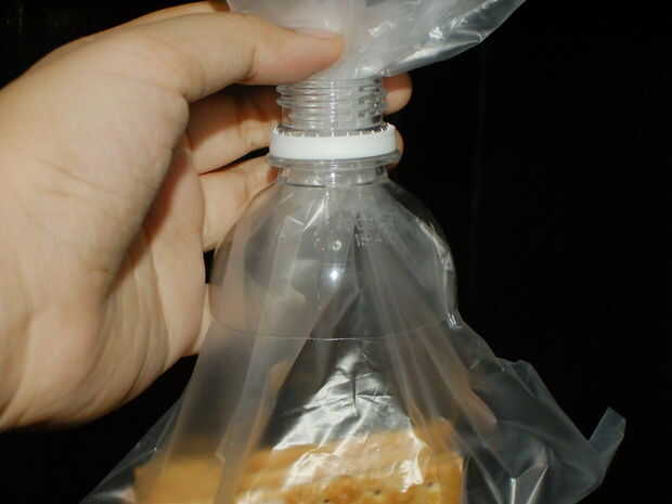 Inserte la bolsa de plástico a través de la boca de la botella.