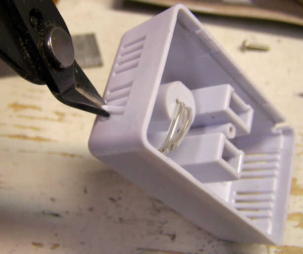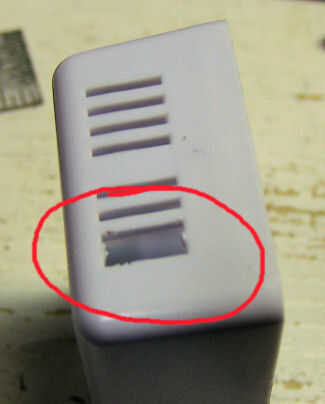 Para montar el módulo en la caja lo hice en este proyecto, los cables deben salir al final del módulo en vez de venir hacia fuera de los orificios existentes. Uno de los listones Retire el orificio de ventilación tal como se muestra. Puede cortar el con cortadores pequeños o simplemente sáquelo en cada extremo con un destornillador de hoja plana.