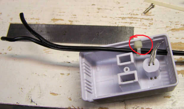 Corte un pedazo de zipcord (cable de la lámpara de 110V) de aproximadamente 1 pie de largo (o dos piezas de 18 trenzado cable de calibre). Poner un pequeño cintillo alrededor de 4 pulgadas de un extremo e inserte el extremo largo del cable a través del agujero de donde se extrajo el listón para que el cintillo es en el interior de la caja. El cintillo actuará como un alivio de tensión para que no tire del cordón hacia fuera.