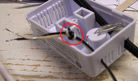Tomar dos longitudes de 1 pie de pequeño calibre de alambre trenzado. Usé un par que halado de un cable de cinta. Los cables deben de color o marcados de manera que puede decir su polaridad para el LED. Un nudo en los cables cerca de 4 pulgadas de un extremo para un alivio de tensión y pasar a través de una de las ranuras de ventilación como se muestra.