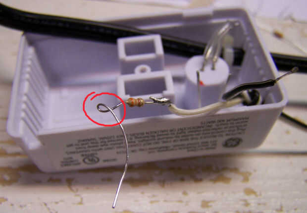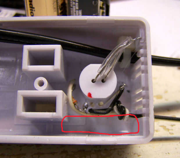 Tira de longitud y uno de los cables de control a un conductor de resistencia cerca del cuerpo de la resistencia de la soldadura. Llevar un pequeño lazo en el otro resistor cerca del cuerpo de la resistencia de la curva (ver primera foto), deslizarla sobre un cable del LED (no importa cual) y soldar en su lugar. Si el resistor está conectado al positivo de lo LED, asegúrese de nota de color que es de alambre y anótelo. Ajuste, tira y el otro cable de control con el cable de LED sin usar la soldadura. Soldar estos cables a los componentes como sea posible. Recorte el exceso de cable y componente conduce de los empalmes de la soldadura. Doblar las puntas de abajo de plano en la parte inferior de la caja en lados opuestos del sensor bien. Mantenga estas expuestas conduce lejos de los lados de la caja, donde va el disipador de calor metálico en forma de U. En la segunda foto el rectángulo rojo muestra la zona para mantener fuera de. A pesar de que el disipador de calor es envuelto en papel, las partes expuestas pueden conectarse eléctricamente a los circuitos de 110V. Podría pot los conductores expuestos de LED/resistor con pegamento caliente si quieres.