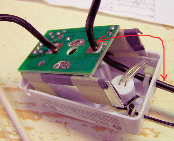 Ejecutar los dos cables de 110V a través de los orificios donde taladrar los remaches como se muestra en la foto. La flecha roja muestra la parte superior del alambre en la ventilación y el agujero del remache a través de la alimentación para los cables lo mejor cuando se cierra el cuadro. Deslice el tablero del circuito hacia abajo de los cables en la caja.
