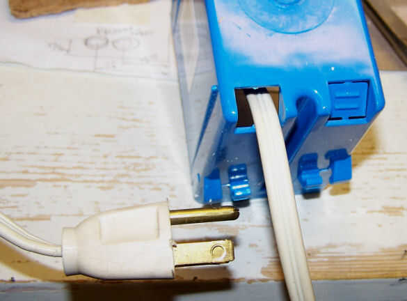 Perfore uno de los agujeros en la base de la caja plástica y pase el extremo de cable de alimentación de 110V. Para alivio de tensión ata un nudo en el cable cerca de 4 pulgadas desde el extremo.