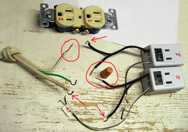 La tierra y los cables de neutro del cable de alimentación deben estañados formados en ganchos para hacer una conexión limpia a la salida y lo mismo para 110V "OUT" conduce de los módulos (flechas).