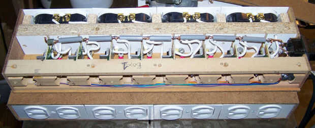 El concepto aquí es el mismo que el Instructable principal, excepto los 8 circuitos de control de luz fueron sacados de sus cajas originales y montados en una caja. Los LED están aislados unos de otros en pocillos individuales con un agujero que expone a sus respectivas células de CdS. La foto muestra un módulo de 8 canales con la parte superior, sentado en el otro módulo que muestra el lado de salida.