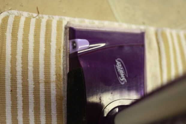 3. Coloque la cabeza del swiffer para que el borde se alinee con el borde del trapo doblado y es casi completamente ese borde. No quiero nada de eso para doblar para arriba sobre el borde de ataque.
