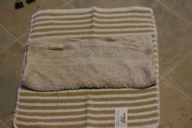 2. dobla el trapo a la mitad y colocar en el centro de la toalla de plato. (este trapo extra añade absorbencia. Si la toalla restregar que encontrado es muy gruesa, puede que desee omitir el trapo. No ser tentados a ligar más que las 3 capas que se muestra o su swiffer voluntad rollaround en el cojín y le molestan).