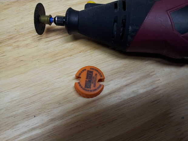 Para proteger el sensor, me encontré con que una tapa de botella de plástico de una botella de refresco de 2 litros cabe la parte posterior del motor casi perfectamente, así que compré algunos deliciosos refrescos y había guardado de las tapas. Alinee la tapa con los terminales del motor. Si ya tienes los cables que estén soldados en su lugar, es más fácil simplemente cortar las muescas de la tapa, de lo contrario podría perforar y deja intacta la pared del casquillo. Utilicé una herramienta giratoria con un disco abrasivo para este trabajo y resultó muy bien. Luego, use un poco de pulido fino para cortar una ranura en la parte superior de la tapa, un poco fuera del centro, para los cables del sensor hall salir a través de. Trate de alinear la ranura con Dónde está el sensor.