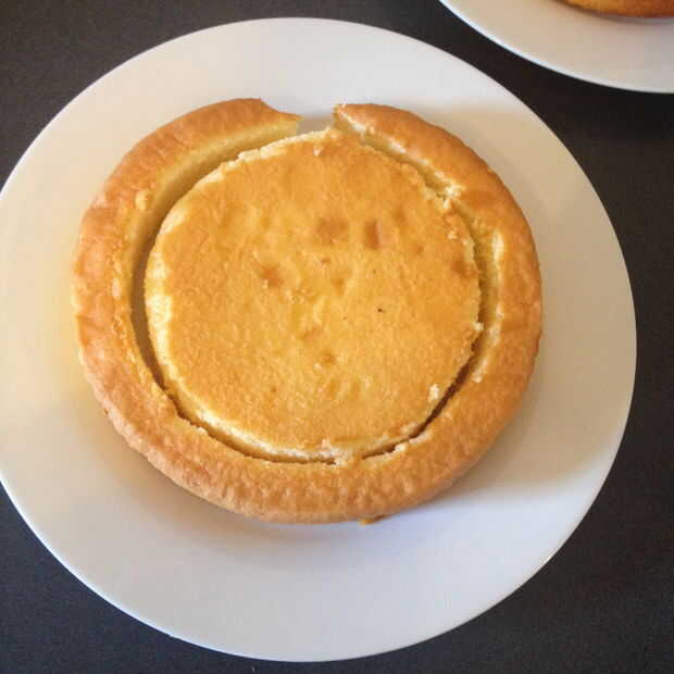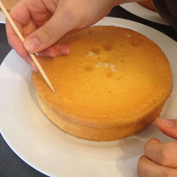 2. Dibujar un círculo de corte en 2 de los pasteles. He usado un pincho pero puede usar lo que quieras. El nivel superior debe tener un círculo pequeño y el nivel medio debe tener un círculo de aproximadamente 1.5 cm en desde el borde de la torta.